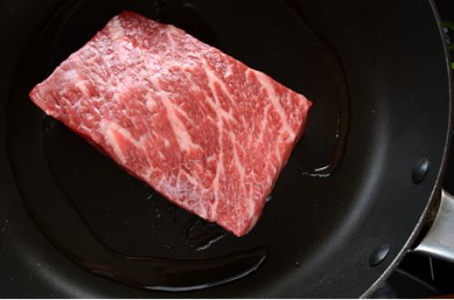 フライパンにサラダ油を熱し、牛モモ肉を中火で全体にきれいな焼き色がつくまで焼く。