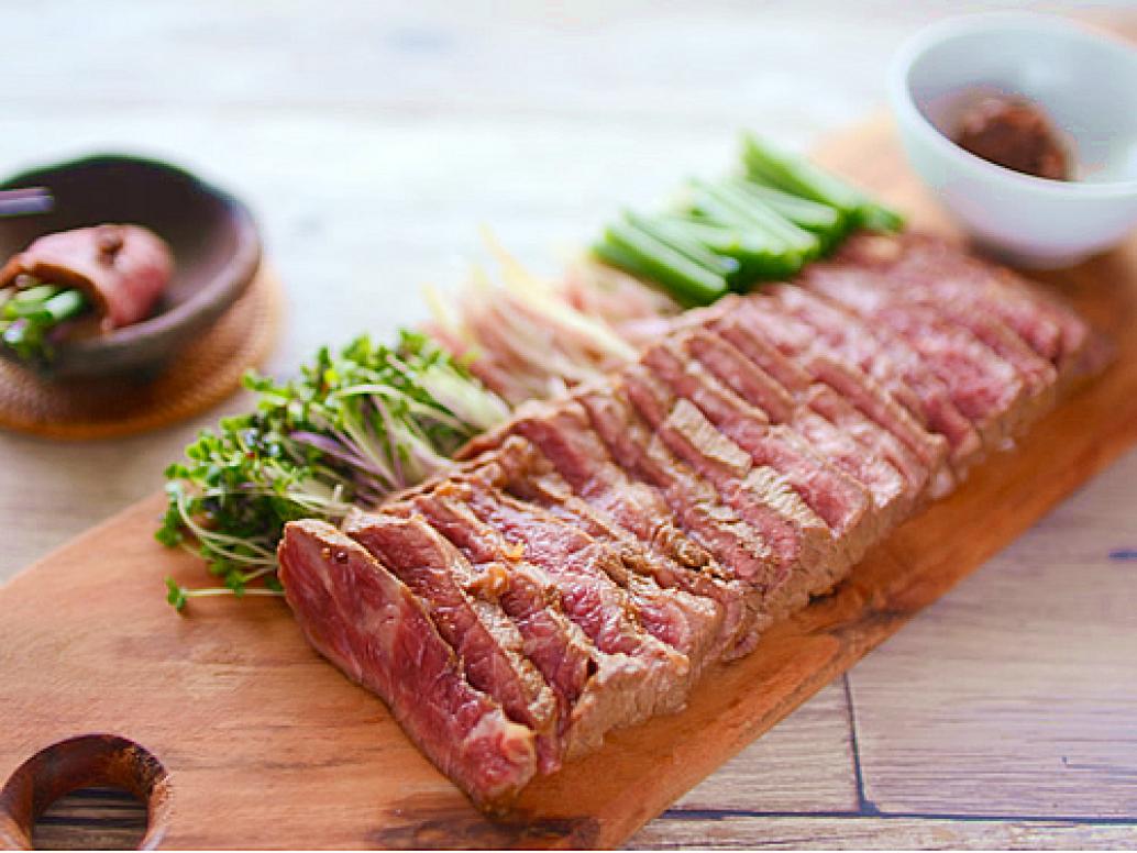 牛肉のまわりの味噌を拭き取り、薄切りにして器に盛り、万能ネギ、スプラウト、みょうが、残りの漬けた味噌を添える。