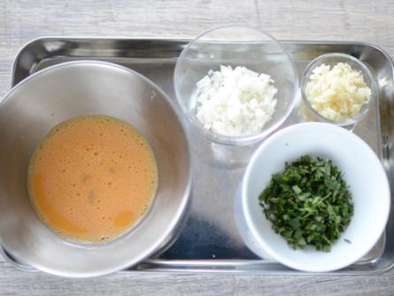 長ネギ、生姜、大葉はみじん切りにする。卵は溶いておく